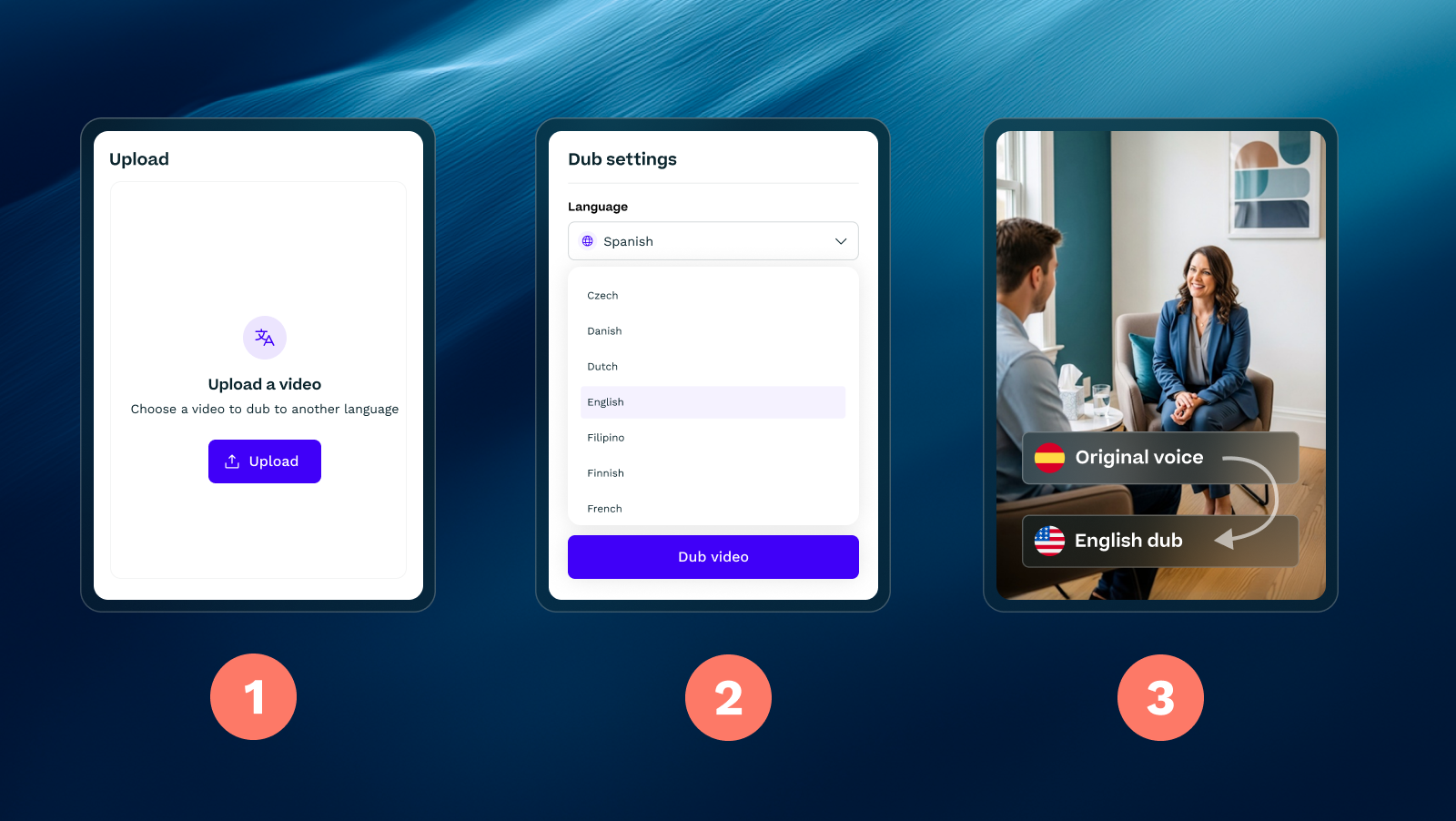You do not need editing experience. AI Dubbing lives inside cofenster. Upload your video and follow three simple steps.